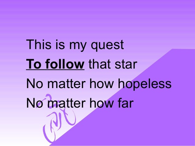 Here are some lines from it, to fight for the right, without question or pause to fight the unbeatable foe to run, where the brave dare not go this is my quest, to follow that star and the.